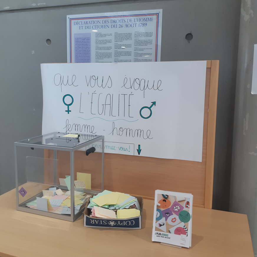Les élus du Conseil de la Vie Lycéenne ont souhaité recueillir les interrogations, opinions et réflexions des élèves autour de l’égalité filles/garçons. Une urne a été installée dans le hall de l’établissement, et ces messages serviront à la création d’un mur d’expression. Ils ont également souhaité afficher des messages forts et percutants sur le harcèlement de rue, les représentations des femmes ou les violences sexuelles.